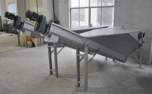 砂水分離器設(shè)備一般螺旋傾角為25~30°之間,砂水混合液從進(jìn)水管進(jìn)入本設(shè)備,混合液通過分離機(jī)上部的聚集箱,在水流的作用下,使混合液的砂粒與有機(jī)物進(jìn)行分離,砂水進(jìn)入集砂槽中,比重較大的顆粒(如砂粒)由于自重而下降,沉積于螺旋槽底部,在螺旋葉片的推動下,物料沿斜置的U型槽底部提升,離開液面后,繼續(xù)上移一段距離,砂粒中的水分逐漸在螺旋槽葉片的空隙中流回水箱,砂粒液逐漸干化到出料口處,依靠自重落入其他輸送裝置中,上清液則不斷從排水堰溢流出去,有機(jī)物在水流漩渦的作用下,也跟著上清液從溢流槽流出,回流至污水井中,從而達(dá)到砂水分離的作用。