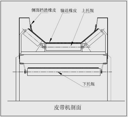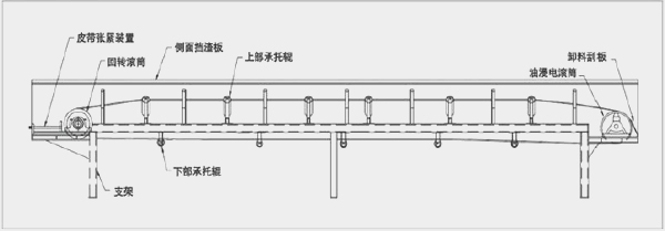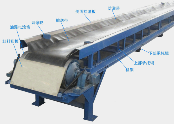 油浸電滾筒(傳動電機)帶動輸送皮帶在承托輥上運動,落入帶上的固體物隨輸送帶一起運動,一直輸送到帶的另一端,完成輸送過程。 帶式輸送機主要由油浸電滾筒、副滾筒、機架、輸送帶、上部承托輥、下部承托輥、調(diào)偏滾、裝緊裝置、卸料板等組成。