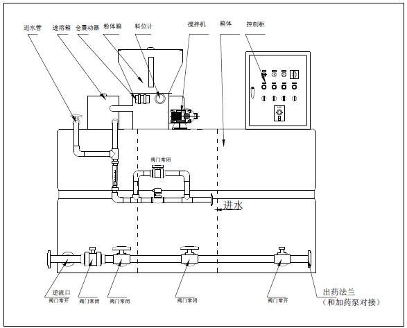 干粉絮凝劑從螺旋推進(jìn)器內(nèi)進(jìn)入速溶器內(nèi)與清水進(jìn)行預(yù)混,被濕潤(rùn)的物料進(jìn)入配制槽進(jìn)行攪拌稀釋,按要求濃度進(jìn)行配制;配制過(guò)程中,進(jìn)水量在流量計(jì)觀測(cè)下必須相對(duì)穩(wěn)定,從而保證在整個(gè)工作工程中,配制溶液濃度不變。