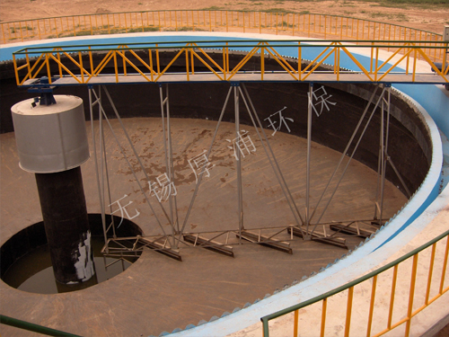 原水從池底經(jīng)中心支墩上不流出,并經(jīng)穩(wěn)流筒配水后,呈輻射狀流向池子周邊集水槽出水,隨著輻向流速的降低,原水中的懸浮物被分離而沉降于池底。工作橋以中心支座為圓心,帶動刮泥、排渣機構(gòu),在驅(qū)動裝置驅(qū)動下將污泥刮集至沉淀池中心集泥槽,依靠水壓或泵排出池外,上部浮渣由刮渣板同步刮至排渣斗排出。